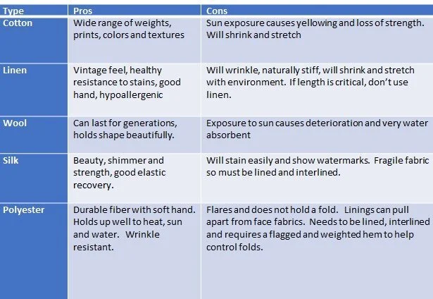Select a fabric that matches the Hand and the Drape required for the window treatment. Stiffer, crisper fabrics work better in pleated drapery and roman shades
